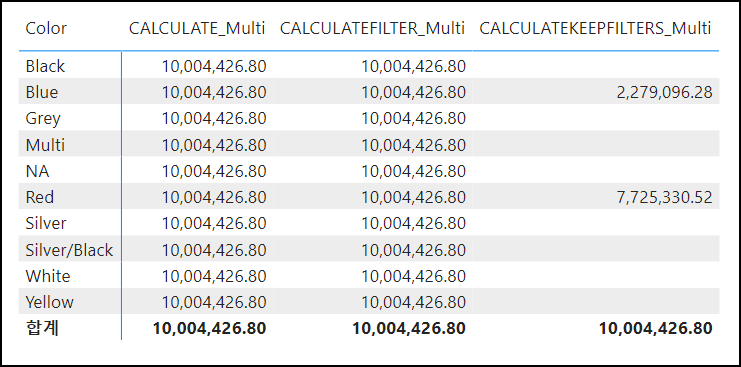 하나의 테이블에서 단일 컬럼의 여러 값을 필터링하여 측정값을 구성해보겠습니다. 예를 들어 제품의 색이 Red, Blue 인 경우의 총매출 측정값을 정의합니다.