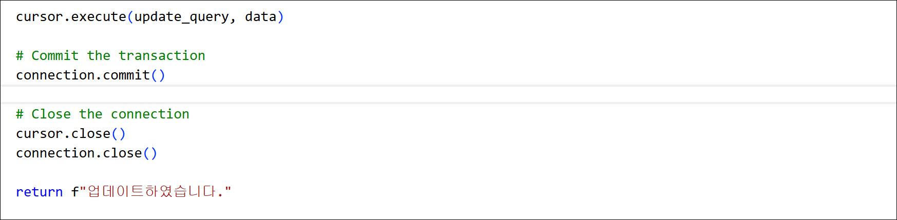 그후에는 execute, commit 함수를 호출하고 close 해야 합니다.