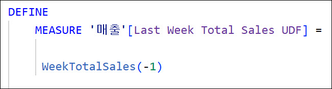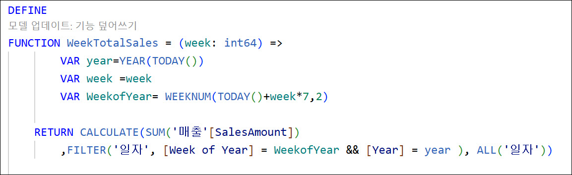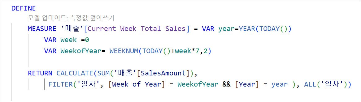 측정값 DAX 수식은 거의 동일하며, 이번주 아니면 저번주만 바뀌면 됩니다. Week가 0이면 이번주 총매출을 구해주며, week가 -1이면 저번주 총매출을 반환해주면 됩니다. 이런 경우 측정값에서 해당코드로 구현해도 되지만, 함수를 만들고 호출해주면 더 효율적입니다.