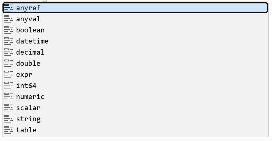 매개변수 데이터 형식은 정해져 있으며, DAX 쿼리 보기에서 a : 을 입력하면 인텔리센스로 데이터 형식을 알 수 있습니다. 매개변수 a의 경우는 정수이므로 int64를 지정하면 됩니다.