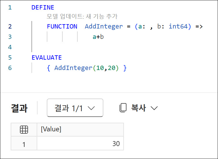 예를 들어, 정수 더하기를 수행하는 DAX UDF는 다음과 같습니다.