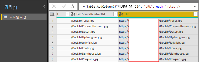 쿼리 편집으로 가서 살펴보면 실제 이미지의 경로가 바로 나타나지는 않습니다. 불필요한 열은 제거하고 File의 ServerRelativeUrl 또는 FieldValuesAsText의 FileRef 등을 확장해보면 이미지의 경로를 확인할 수 있습니다.