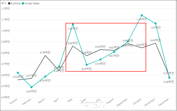선형 차트의 데이터 레이블 위치를 지정할 수 있습니다. 데이터 레이블의 색깔을 지정하여 구분할 수 있지만 위, 아래 위치를 지정하여 보다 더 명확하게 표시할 수 있습니다.