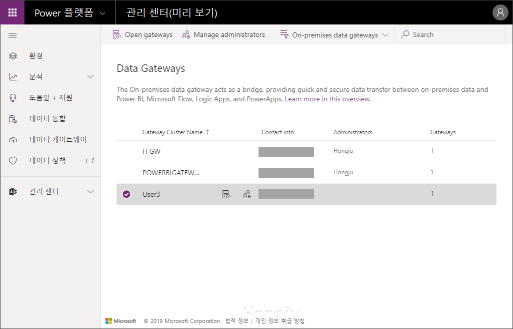 데이터 게이트웨이(On-premises data gateway)는 Power BI에서만 사용하는 것이 아니라 다른 서비스에서도 이용이 가능합니다. Power BI, PowerApps, Flow, Logic Apps에서 사용이 가능합니다.