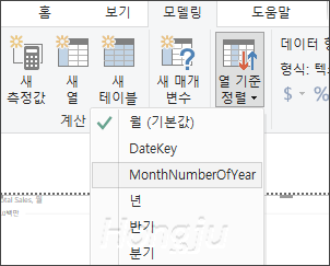 이럴 경우 원하는 정렬에 맞는 열 (여기서는 MonthNumberOfYear)을 가지고 있다면 모델링 > 열 기준 정렬 > MonthNumberOfYear 를 지정만 해주면 됩니다. MonthNumberOfYear 열은 쿼리 편집에서 손쉽게 생성할 수 있습니다.