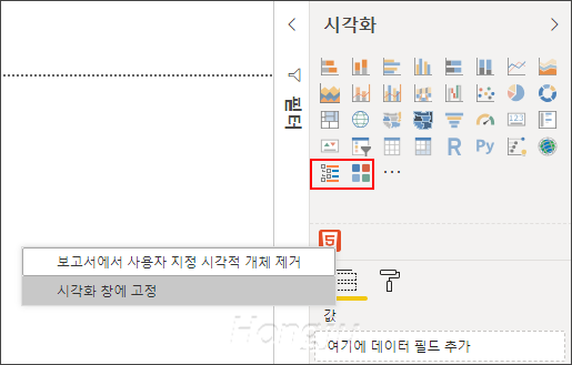 사용자 지정 시각적 개체를 추가하고 보고서를 작성한 후 Power BI Desktop을 닫고, 다시 열면 추가한 사용자 지정 시각적 개체가 사라져서 다시 추가해야 할 수도 있습니다. 그런 경우 사용자 지정 시각적 개체를 오른쪽 클릭하여 ‘시각화 창에 고정’을 선택해서 계속 유지하게 할 수 있습니다. 필요 없다면 고정을 해제하면 됩니다.