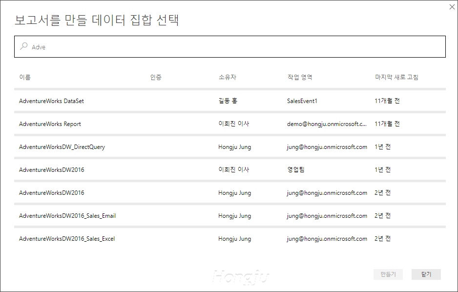 데이터 가져오기의 Power BI 데이터 세트를 통해 해당 사용자 계정의 권한 있는 전체 작업영역의 공유, 인증된 데이터 세트를 연결할 수 있습니다.