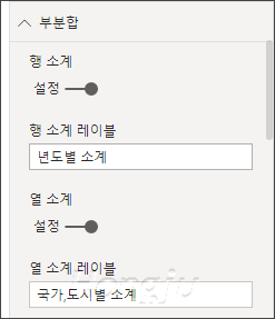 표, 행렬에서 부분합 레이블을 설정할 수 있습니다. 부분합의 행 소계 레이블과 열 소계 레이블, 행 수준의 합 레이블을 ‘합계’라고 표시하고 않고 사용자 지정으로 설정할 수 있습니다.