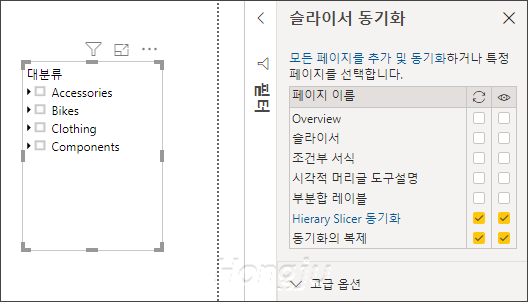 기본 슬라이서외에 Hierarchy Slicer 슬라이서에도 동기화를 지원할 수 있습니다.