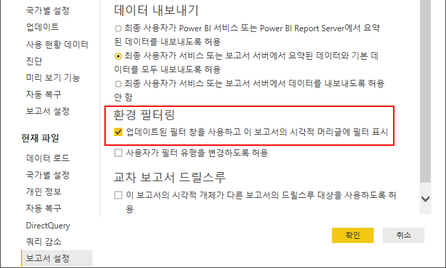 기존 버전의 보고서를 열어, 옵션 및 설정, 옵션으로 이동하고, 현재 파일의 보고서 설정에서 “업데이트된 필터 창을 사용하고 이 보고서의 시각적 머리글에 필터 표시”를 체크하고 확인을 선택합니다.