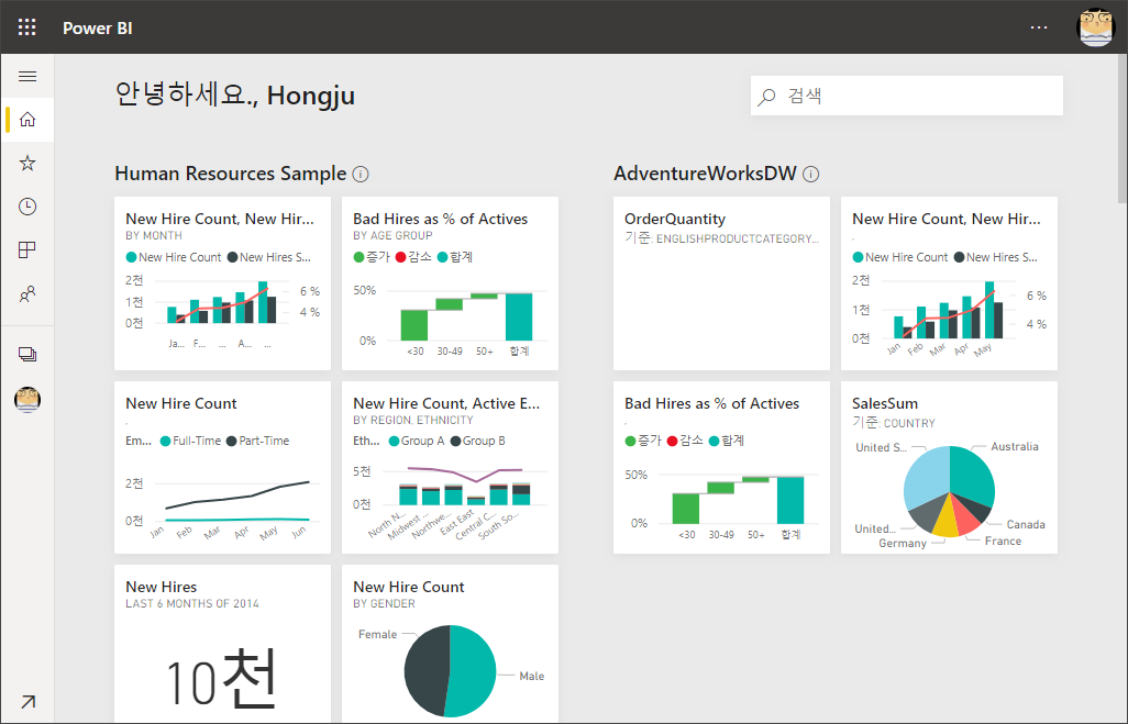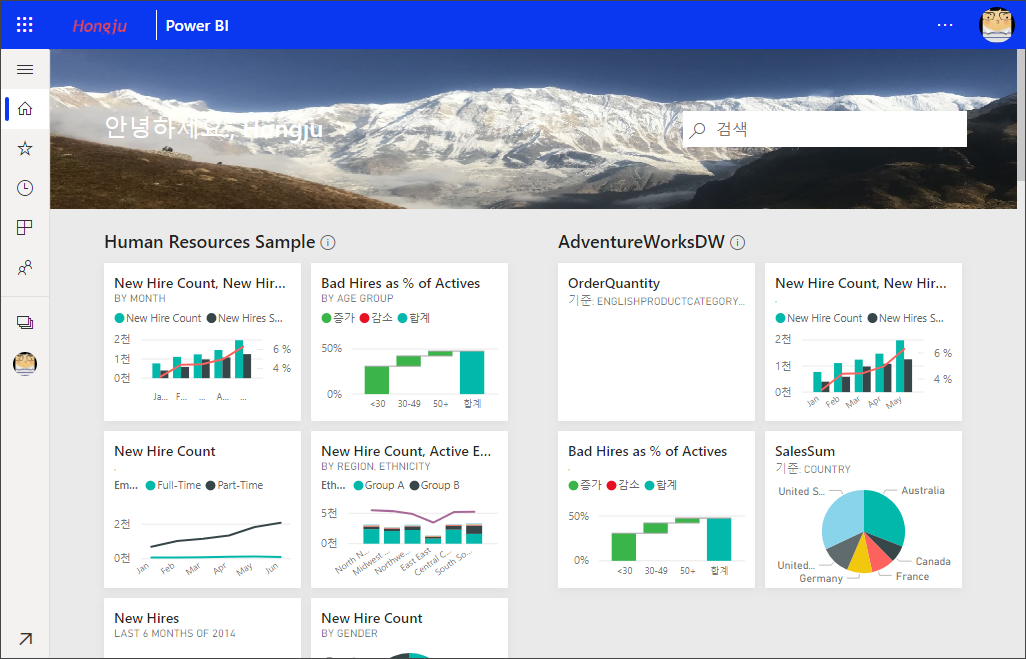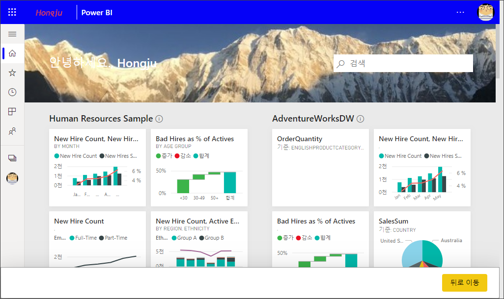 커버 이미지: Power BI 홈을 열면, 메인의 윗 부분에 커버 이미지를 추가할 수 있습니다. 이미지를 추가하고 자르기를 통해 이미지 표시 부분을 변경할 수 있습니다. 1mb이하, 1920X160픽셀 이상의 jpg 또는 png 파일