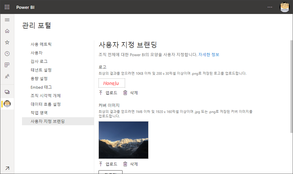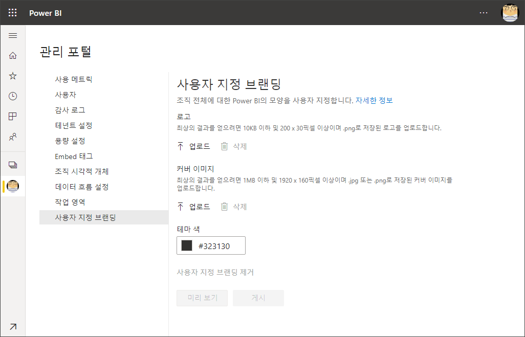 8월말부터 사용자 지정 브랜딩이 제공되었습니다. Power BI 관리 포털에 가보게 되면 사용자 지정 브랜딩이라는 메뉴를 확인 가능합니다.