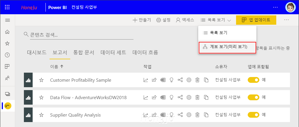 앱 작업 영역으로 이동하여 상단의 목록 보기를 클릭하면 계보 보기(미리 보기) 메뉴를 확인할 수 있습니다.