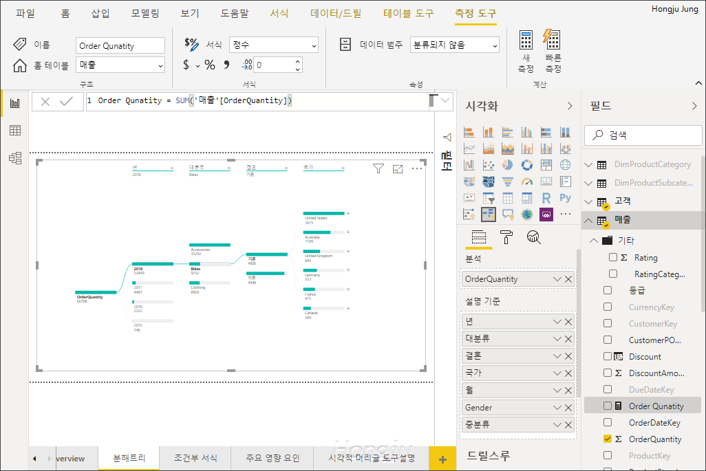 필드의 테이블, 열, 측정값을 선택하면 그에 따라 동적으로 테이블 도구 등의 메뉴가 나타납니다.