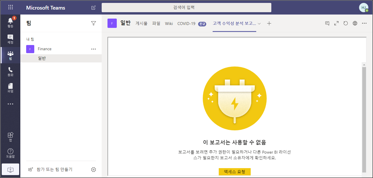 물론 해당 Power BI 보고서에 Power BI 권한(공유 받거나 작업 영역 구성원)이 있는 사용자여야 하며 권한이 없다면 보고서가 제대로 표시되지 않습니다. 어떤 경우, Power BI에서 해당 보고서를 Microsoft Teams 팀 구성원에게 공유해주어야 할 수도 있습니다.