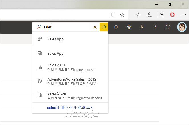 3월 중순부터는 Power BI 서비스에 로그온하면 오른쪽 상단에 검색 상자를 확인할 수 있습니다.