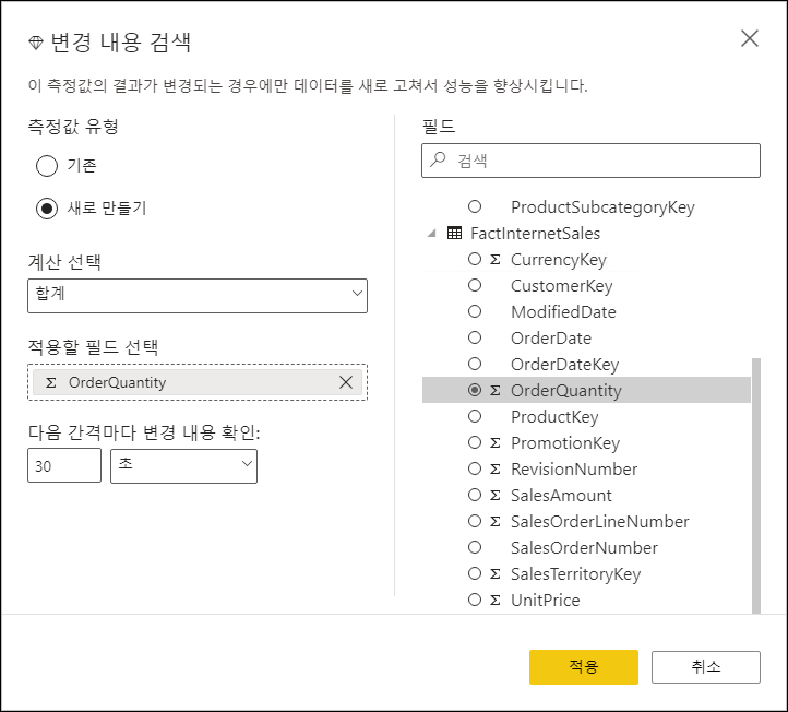 DirectQuery 모드에서 자동 페이지 새로 고침의 경우 매번 쿼리를 실행하기 때문에 변경 내용이 없다면 불필요한 쿼리가 실행될 수 있습니다. 변경 내용을 주기적으로 확인하여 변경되었다면 페이지를 새로 고치게 할 수 있습니다. 페이지 새로 고침의 변경 내용 검색(미리 보기) 기능은 DirectQuery 모드에서 지원되며, 프리미엄 작업 영역에서만 동작합니다. 변경 내용은 하나만 생성할 수 있으며, 관리 포털에서 설정이 적용이 됩니다.