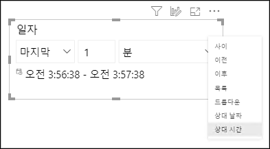 상대 날짜 필터는 마지막 7일과 같이 동적으로 날짜가 지정되는데, 상대 시간 필터로 마지막 5분 등과 같이 시간을 지정이 가능합니다. 또한 필터에서도 상대 시간 필터를 지정이 가능합니다.