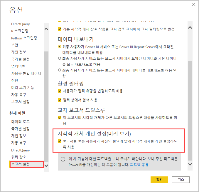 시각적 개체의 개인 설정(미리 보기)은 보고서를 보는 사용자가 본인에 맞게 맞춤 설정할 수 있습니다. Power BI Desktop에서는 미리 보기 기능과 보고서 설정을 선택하고, 시각적 개체 머리글에 개인 설정 아이콘이 나오게 설정하여 게시해야 합니다.