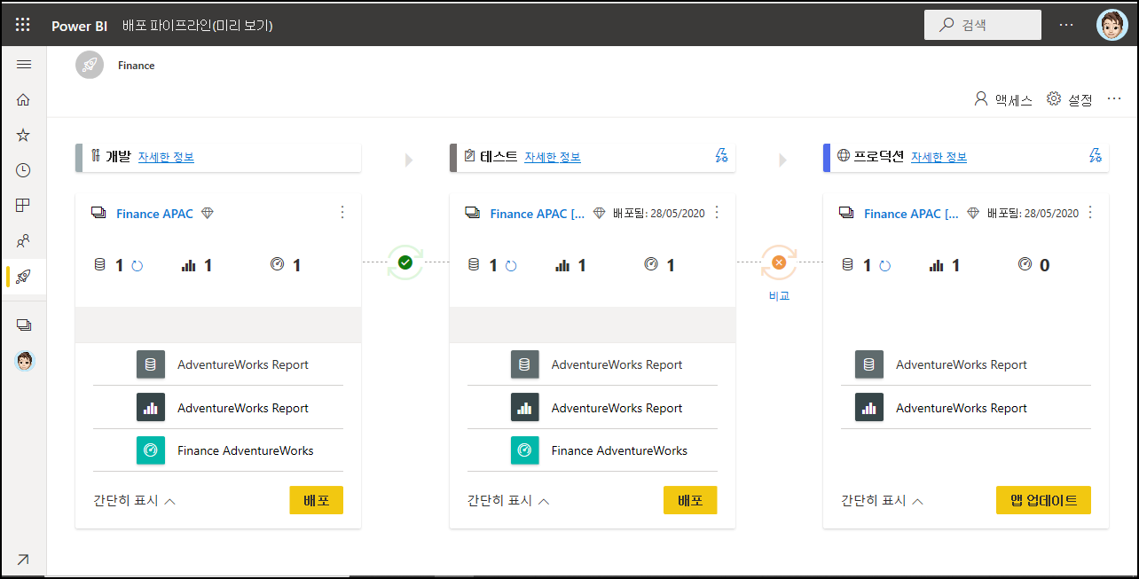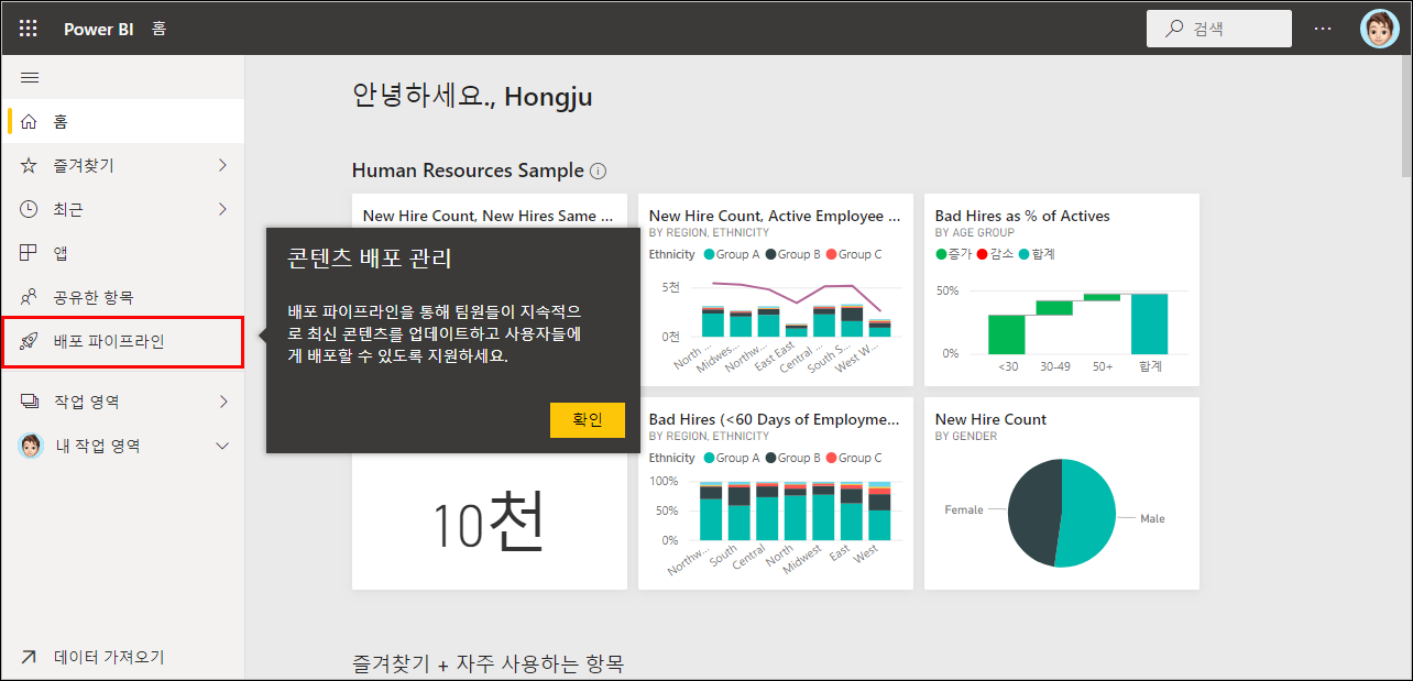 Power BI 서비스에 로그온해서 왼쪽 탐색 메뉴를 보면, [배포 파이브 라인]이라는 메뉴가 나타나는 것을 확인할 수 있습니다.