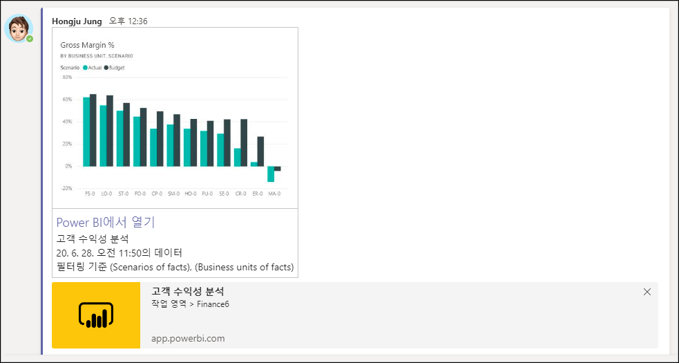 Teams에서 확인해보면 다음 이미지와 같이 나타납니다. 차트 이미지 등의 아이콘이 아닌 Power BI 아이콘이 나타나며, 링크가 추가되어 있습니다.