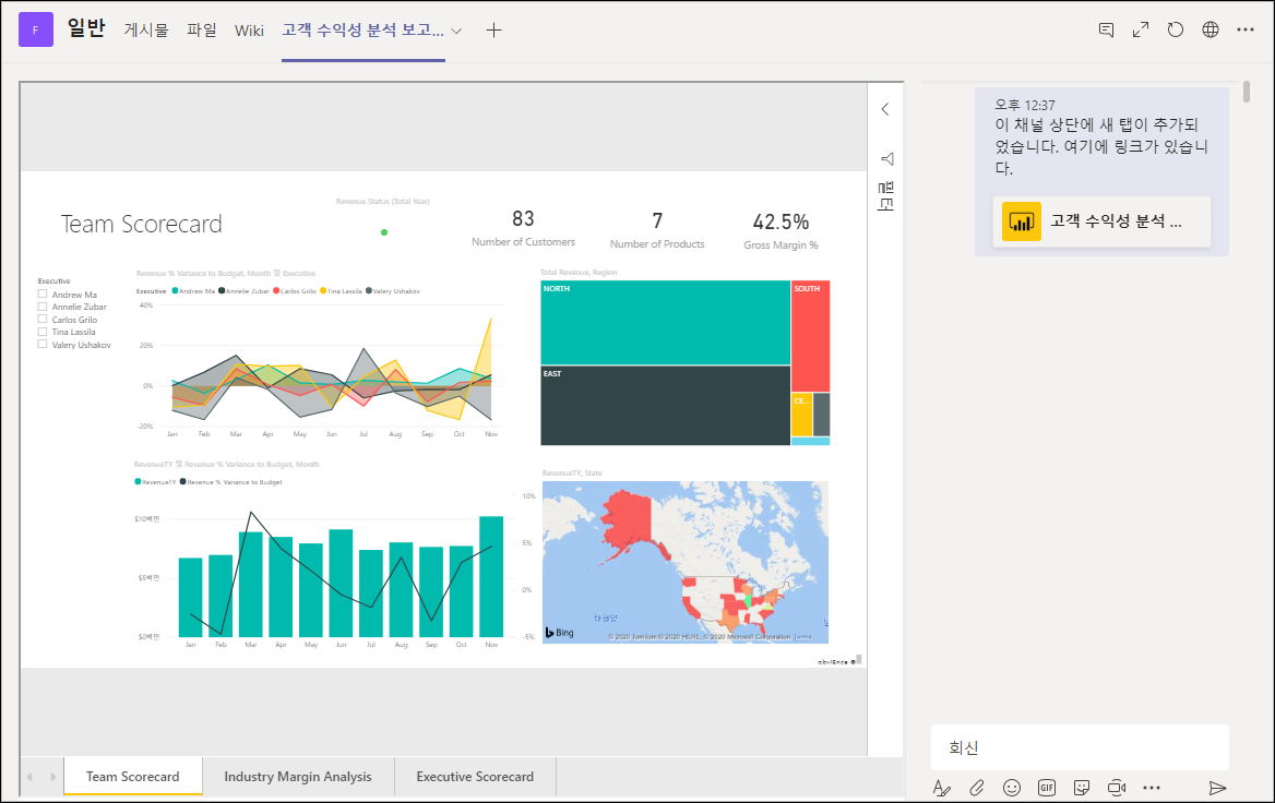 Power BI에서 해당 대시보드, 보고서, 시각적 개체를 Teams의 채널에 게시물로 공유할 수 있습니다.