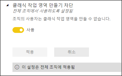 그러면 다시 돌아가서 클래식 작업 영역이 생성되지 않게 하면, 지저분하지 않고 위 문제가 발생되지 않을 것 같습니다. Power BI의 테넌트 설정으로 가서 ‘클래식 작업 영역 만들기 차단’을 사용으로 변경합니다. (설정을 변경하면, 한번도 액세스하지 않은 빈 작업 영역 등은 삭제된다고 하는데, 테스트해보지는 않았습니다. 미리 고려한 후 설정을 변경해야 합니다.)