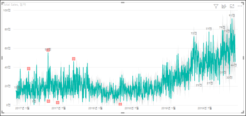 변칙 탐지(Anomaly Detection)는 이상점을 바로 확인할 수 있는 미리 보기 기능으로, 분석 창에서 설정할 수 있습니다. 변칙 탐지에 대한 자세한 내용은 여기에서 확인할 수 있습니다. X축은 날짜 형식이거나 날짜 계층에 대해서만 변칙을 지원합니다. 아래 화면의 빨간색 셰이프가 이상점에 해당됩니다.