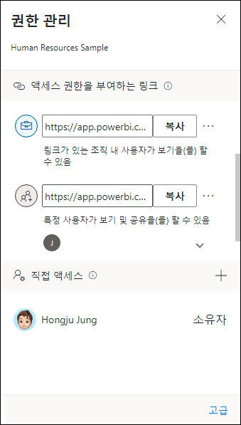 권한 관리 창의 맨 아래 ‘고급’을 클릭하게 되면 링크를 제거하거나 직접 액세스 사용자를 제거, 설정 변경을 할 수 있습니다.