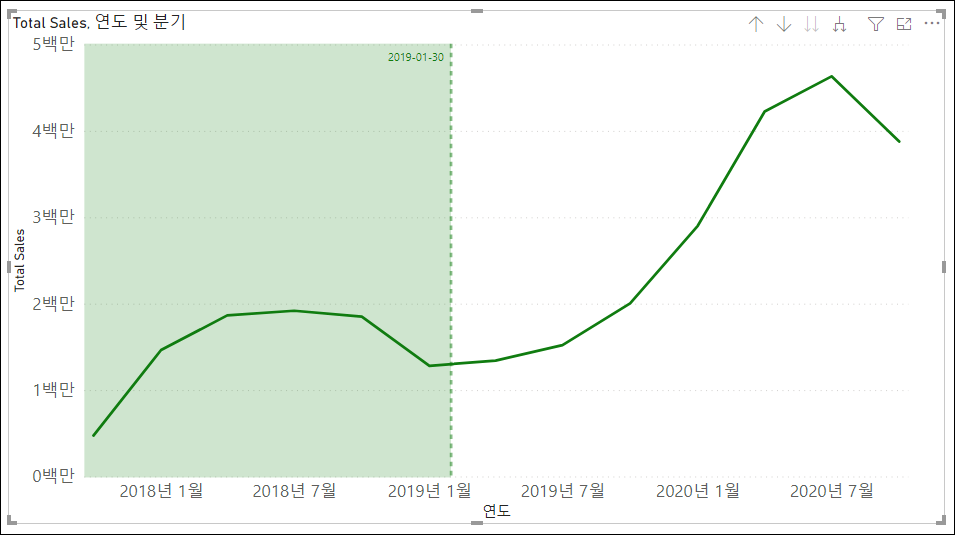 X축 상수 선은 값을 지정하고, 이전 또는 이후를 지정하게 되면 차트에서 다른 영역을 강조하거나 감추는 느낌을 줄 수 있습니다. 분석 창에서 상수 선을 추가하고 서식을 변경하면 됩니다.