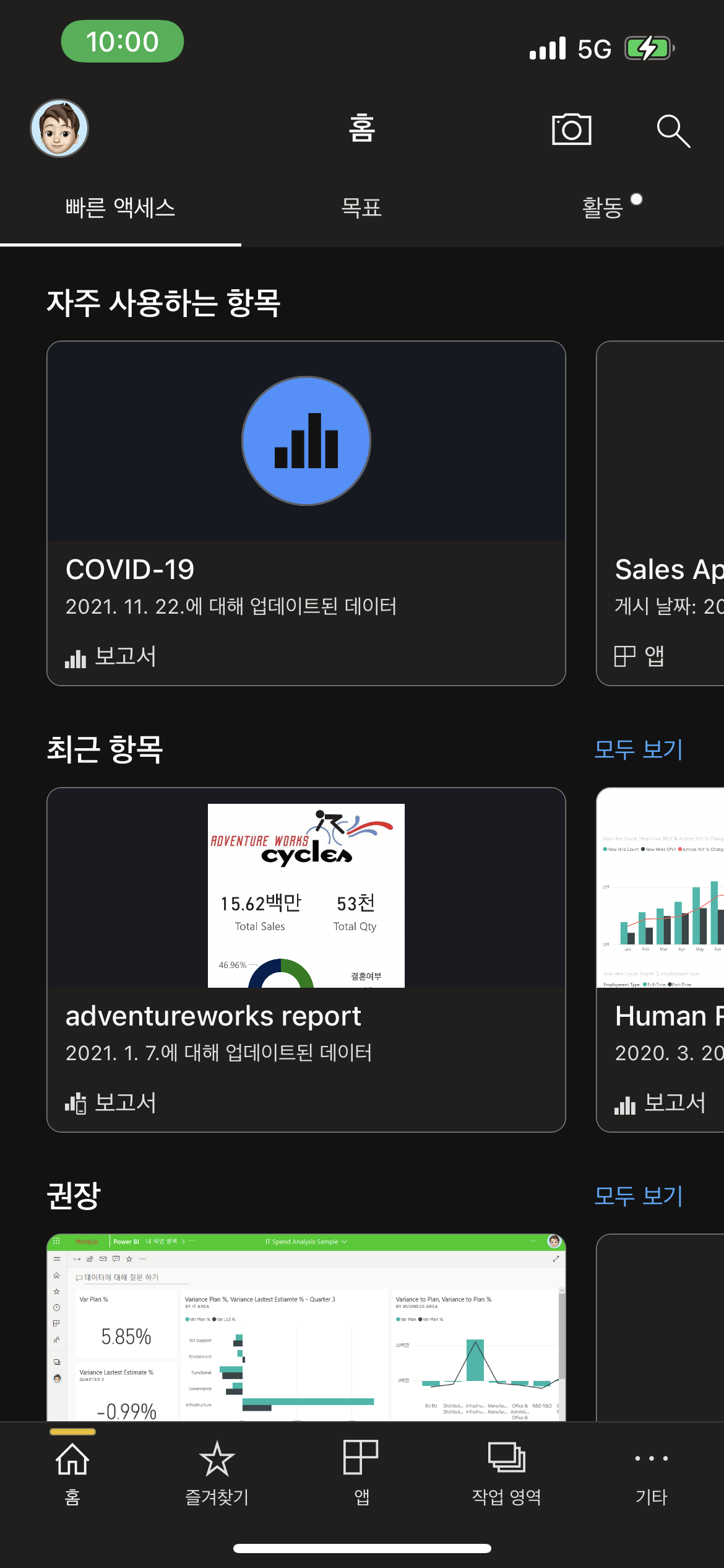 Power BI Mobile에서는 바코드와 유사하게 보고서의 QR 코드를 통해 필터된 보고서를 바로 액세스 할 수 있습니다. 그래서 앱의 홈 상단에 카메라가 올라가 있습니다.