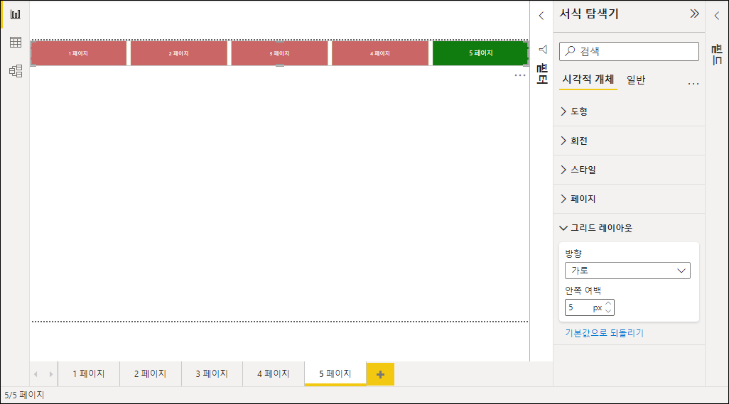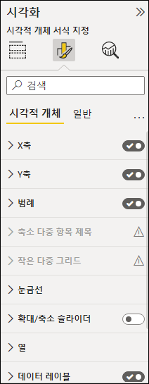 서식 아이콘을 클릭하게 되면 시각적 개체와 일반 탭으로 나뉜 서식 창을 볼 수 있습니다. 일반 탭의 서식 속성은 공통적인 제목, 도구 설명 등 속성이 위치해 있습니다. 서식의 설정/해제 토글 버튼도 변경된 것을 확인할 수 있습니다.