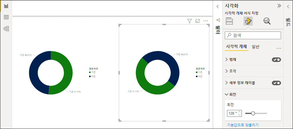 원형 차트와 도넛 차트의 회전 속성을 적용하여 시각화 할 수 있습니다.
