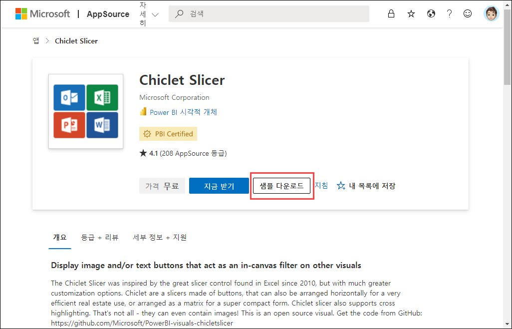 AppSource에서 시각적 개체를 검색하여 상세 페이지로 들어가면 로그온하지 않고 바로 샘플을 다운로드 할 수 있습니다.