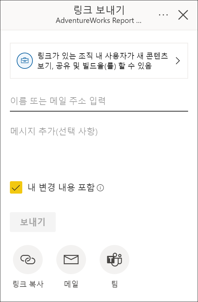Power BI Service에서 공유하는 방법 중 링크 보내기를 알고 계실건데요. 링크 보낼 때 필터 또는 클릭하여 변경 사항을 포함하여 링크를 보낼 수 있습니다. 간단하게 원하는 필터링으로 필터한 후 공유 아이콘 버튼을 누르면 됩니다.