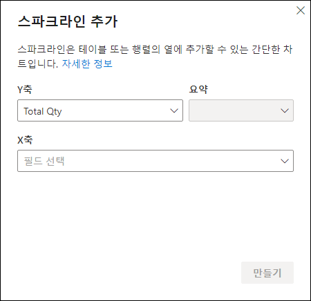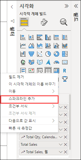 테이블이나 행렬에 필드를 추가하고, 표시하려는 필드의 아래쪽 화살표를 클릭하게 되면 [스프크라인 추가] 메뉴를 확인할 수 있습니다.