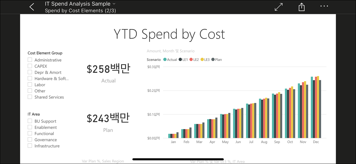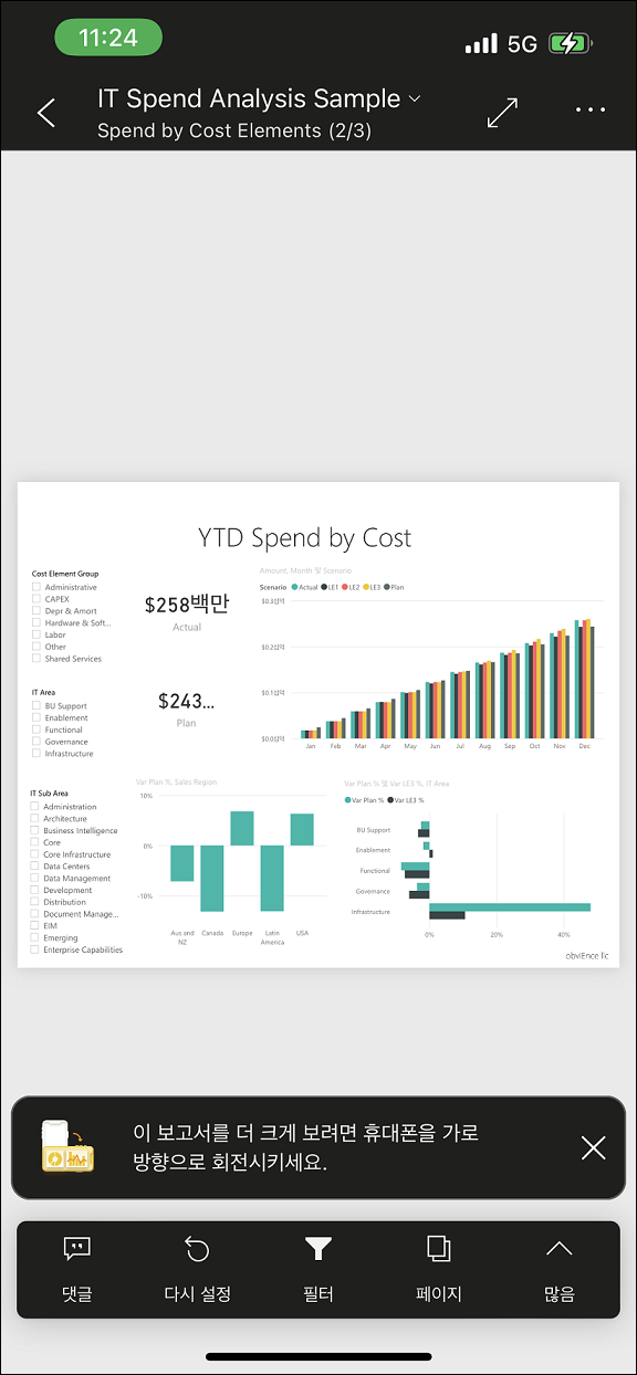 Power BI Mobile 앱에서 보고서를 확인하려고 하면 모바일로 최적화되지 않은 보고서의 경우 폰을 가로로 움직여서 보고서를 확인할 수 있습니다. 제법 번거롭습니다. 그래서 최적화하여 보고서를 게시해야 했습니다.