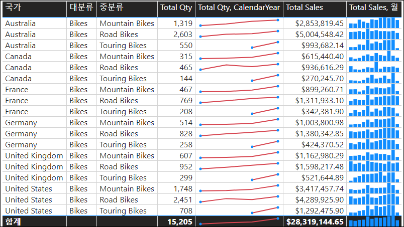 테이블이나 행렬에서 스파크라인에 대한 요구사항이 많았는데 이번 업데이트에서 반영되었습니다.