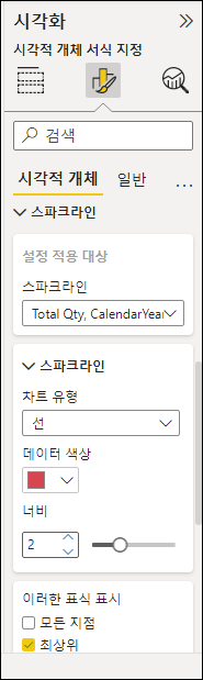 스파크라인은 선과 열 모양을 제공해줍니다. 또한 서식에서 색, 표식 방법을 변경할 수 있습니다. 서식창으로 이동하여 서식을 원하는대로 변경하면 됩니다.