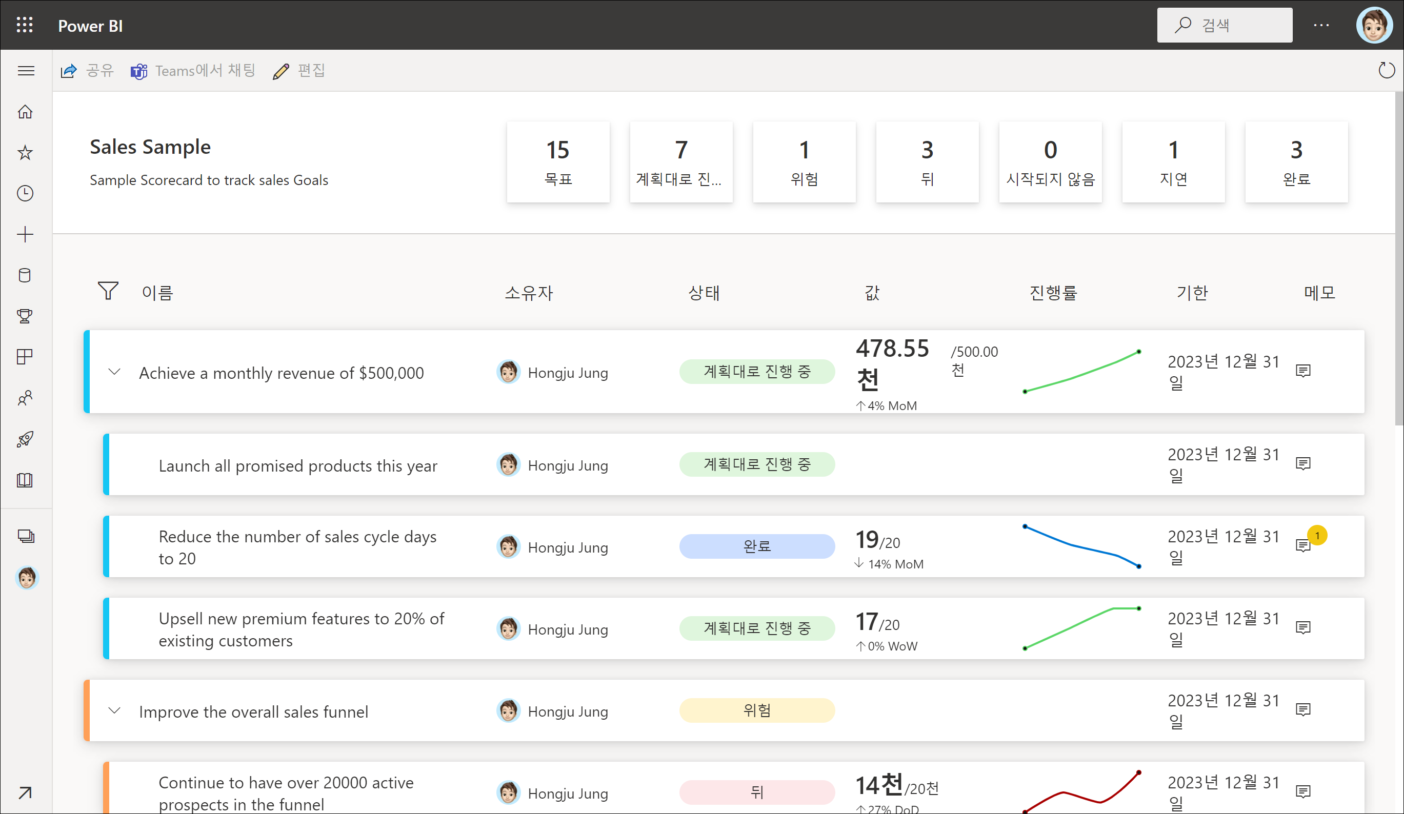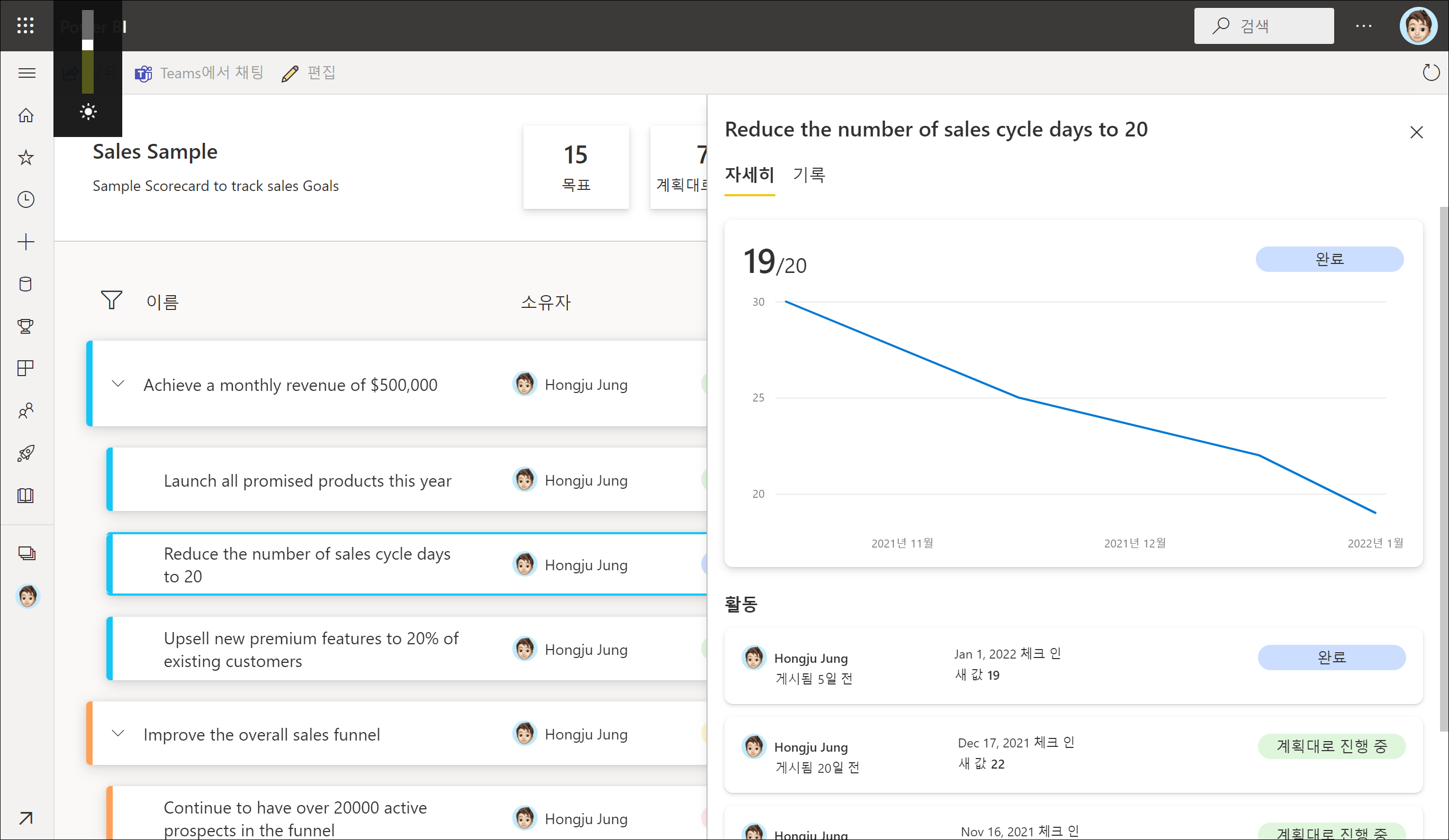 다시 Goals 홈 화면으로 이동하여 다른 샘플 성과기록표를 확인해보시면 Power BI의 Goals가 무엇인지 대략적으로 이해가 될 겁니다.