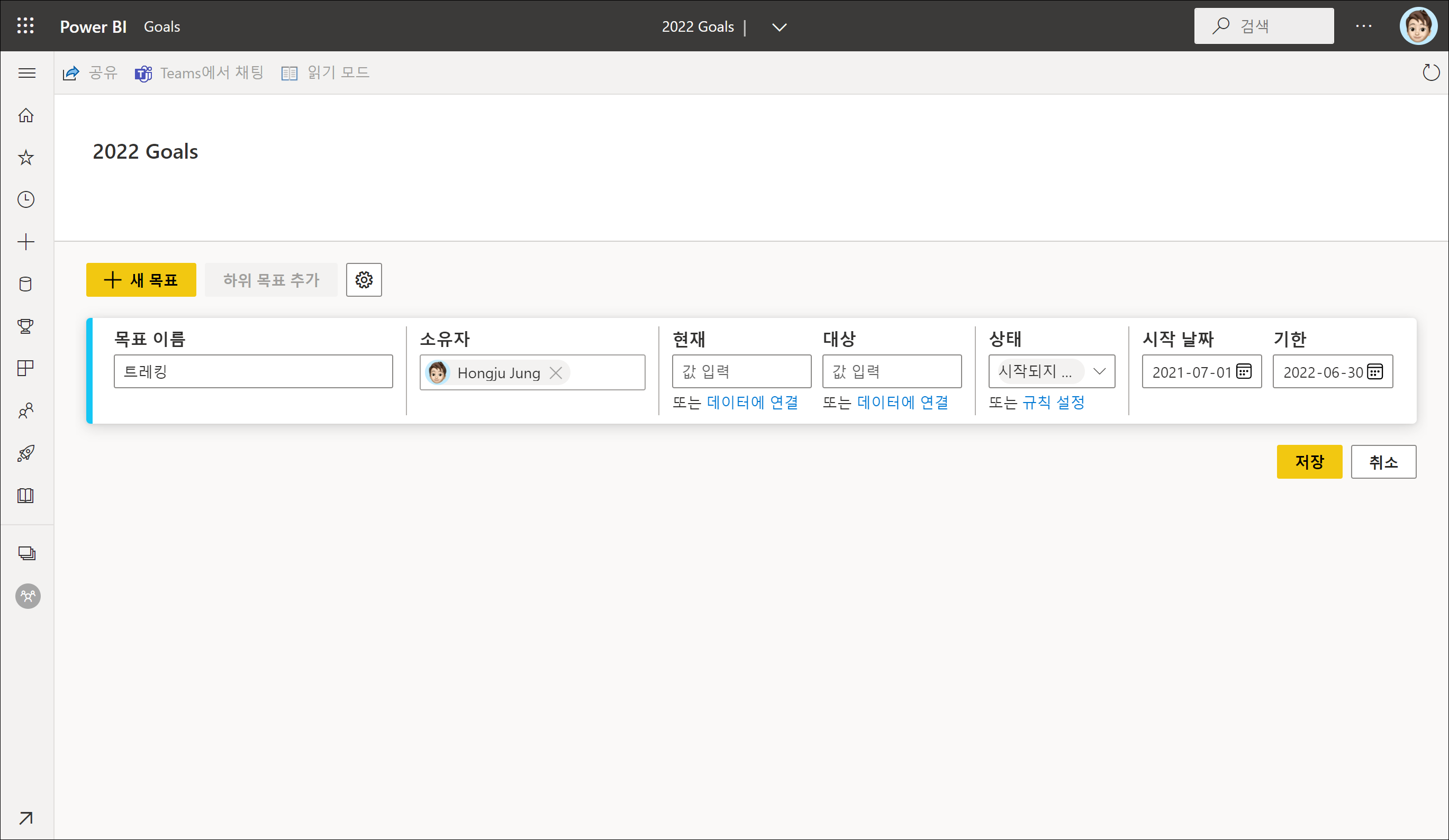 하위 목표에서는 현재, 대상 값을 설정하고 상태를 ‘계획대로 진행 중’으로 선택하고 [저장]을 클릭합니다.