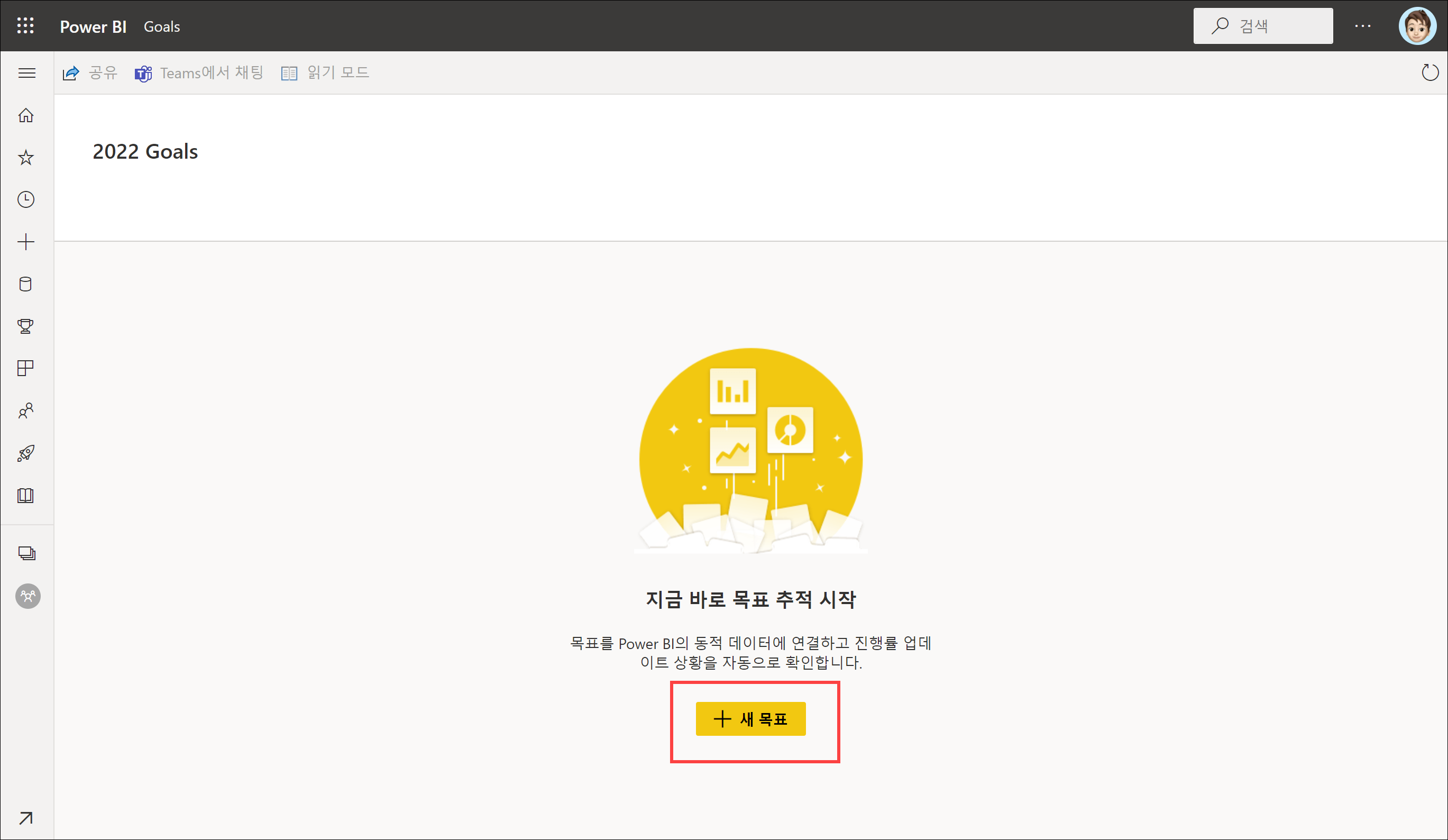 Power BI Pro 라이선스 계정으로 Power BI 서비스의 [Goals] 메뉴를 클릭하여 [새 성과 기록표]를 클릭하여 성과 기록표를 먼저 생성합니다.