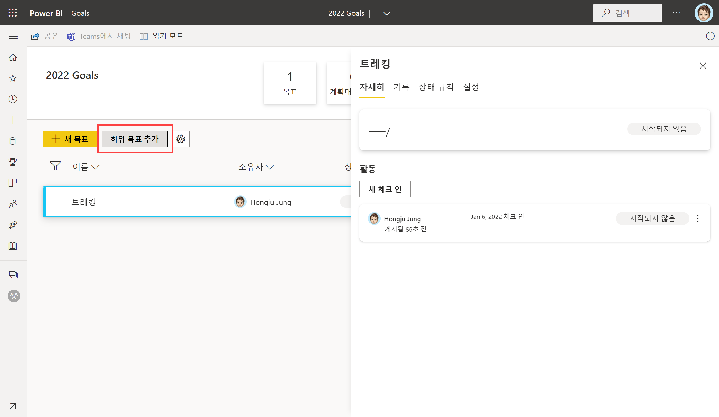 트레킹 목표를 선택하고 [하위 목표 추가]를 클릭하여 목표를 추가해봅니다. 하위 목표의 하위목표를 추가할 수 있습니다.