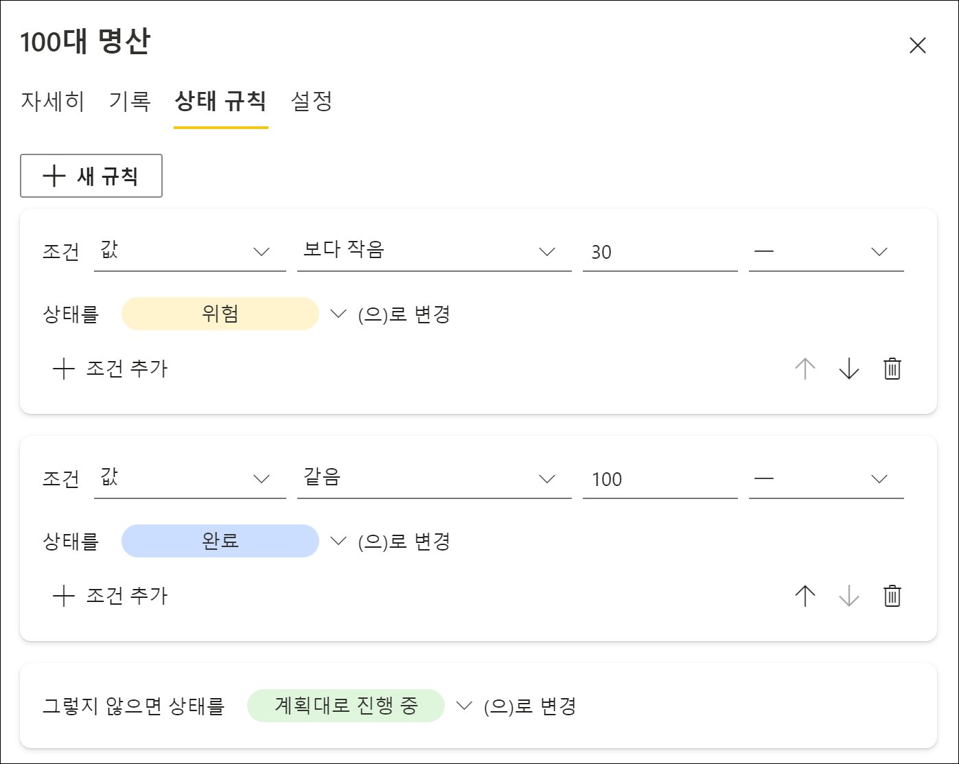 규칙의 경우 IF, ELSE 하나만 적용됩니다. 조건을 추가하게 되면 IF 조건1 AND 조건2, ELSE가 됩니다. ELSE IF를 여러 개 추가하려면 규칙을 추가해야 합니다. 여기서는 현재 값이 30보다 작으면 [위험]으로 상태를 설정하고 그렇지 않으면 [계획대로 진행 중]으로 설정합니다.