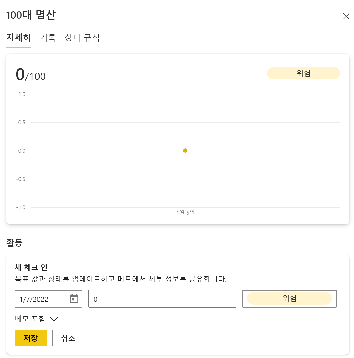 상단 메뉴에서 [읽기] 버튼을 클릭하여 목표를 확인해보면 현재 값이 0이어서 [위험]으로 나타나는 것을 확인할 수 있습니다.