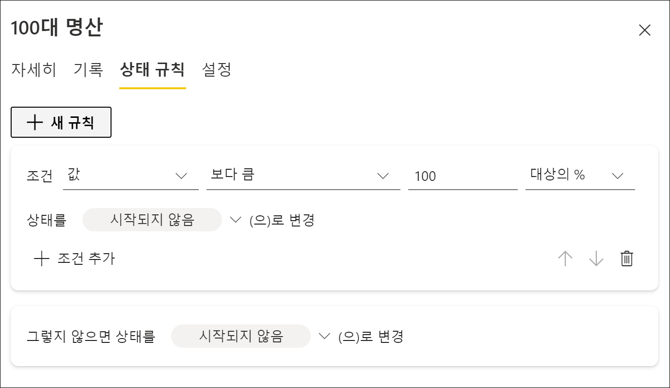 상태의 경우 수작업으로 지정할 수도 있지만 현재 값이 변경될 때 규칙에 따라 변경되게 구성할 수 있습니다. 상태로 이동하여 [규칙 설정]을 클릭합니다.