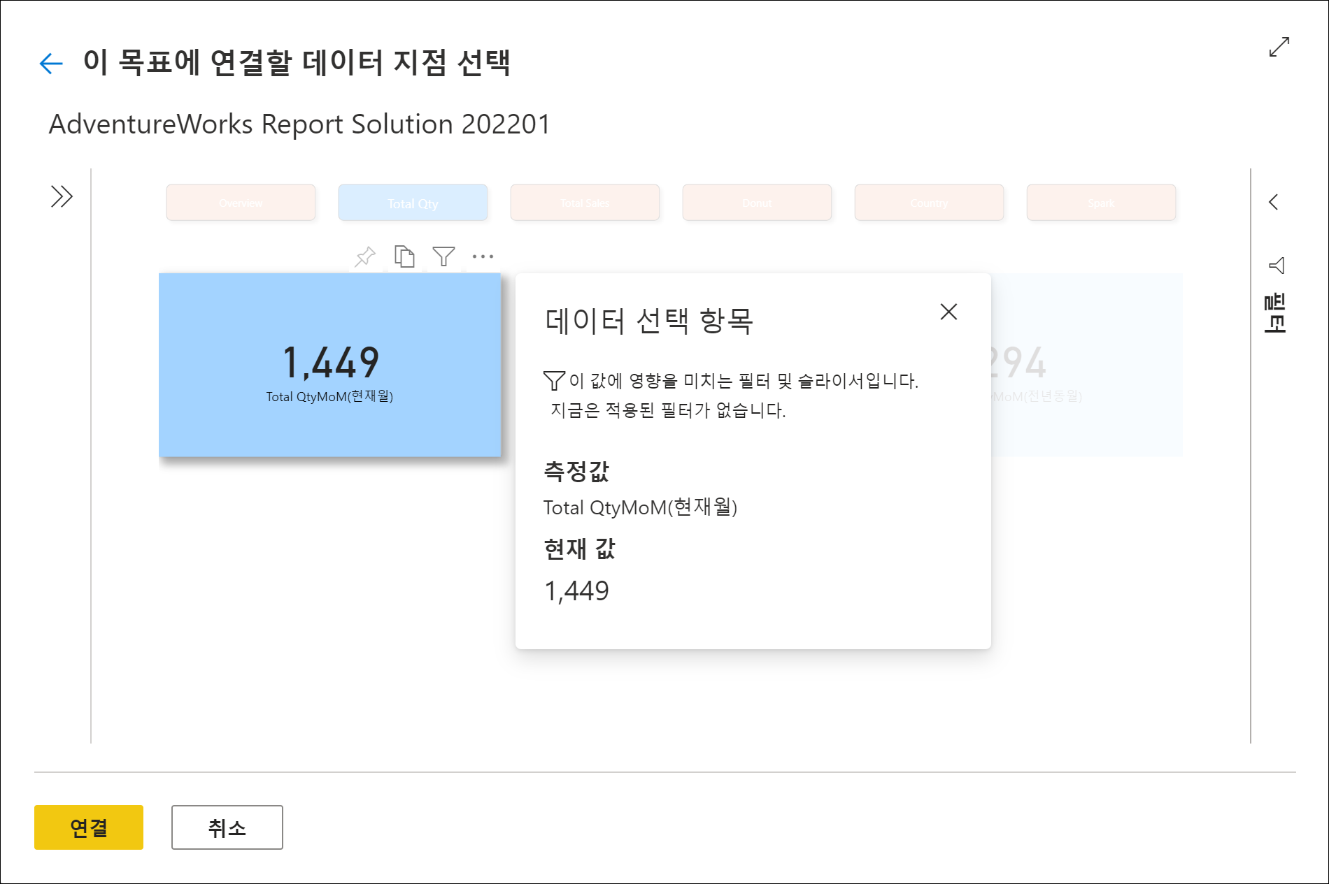 현재 값에 대해서는 현재월의 측정값이 연결되어 있는 카드를 선택하겠습니다. 선택하게 하게 되면 [데이터 선택 항목]을 확인할 수 있고, 필요시 필터를 적용하여 필터링된 측정값을 연결할 수도 있습니다. [연결]을 클릭하면 목표에 연결됩니다.