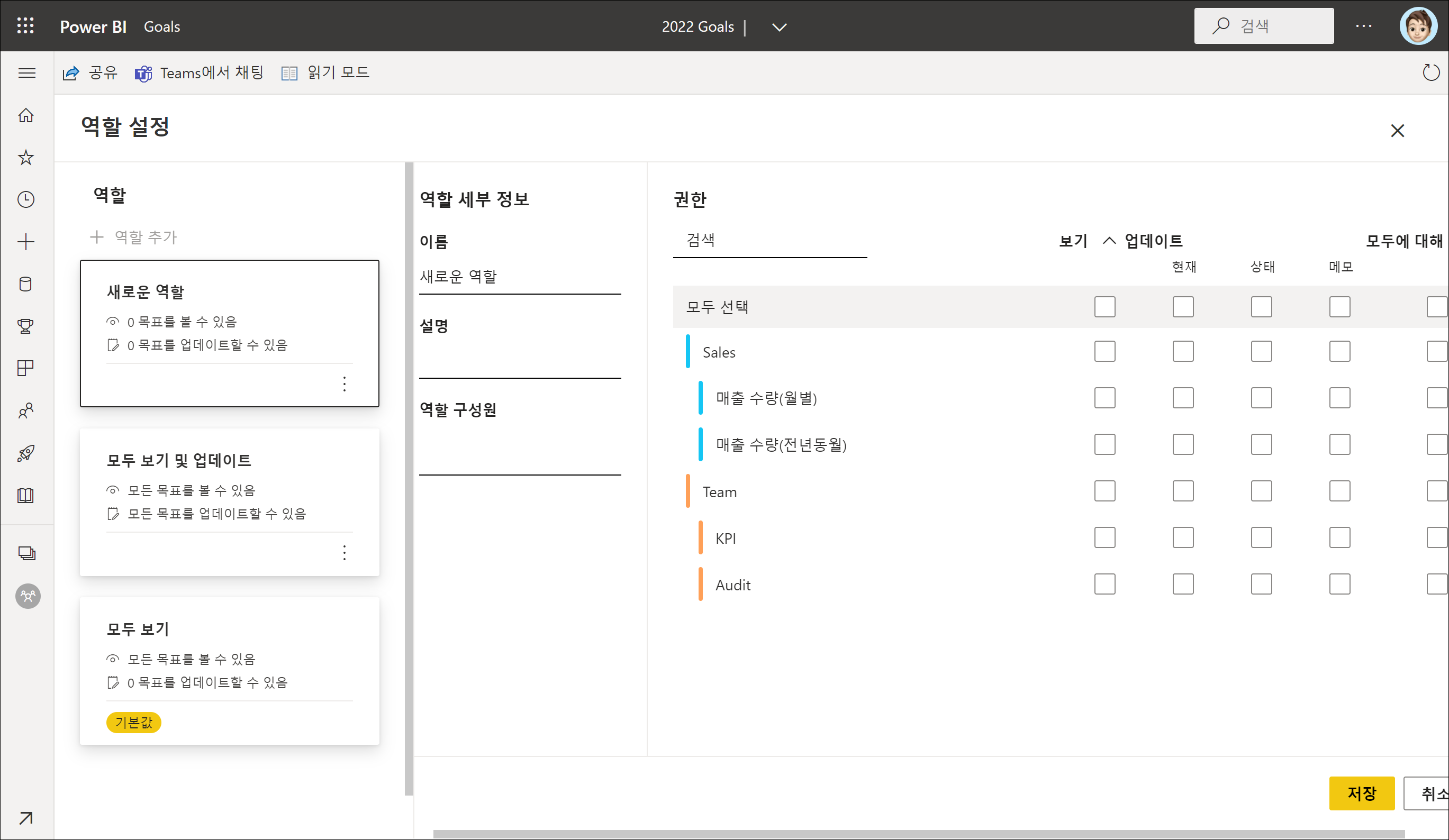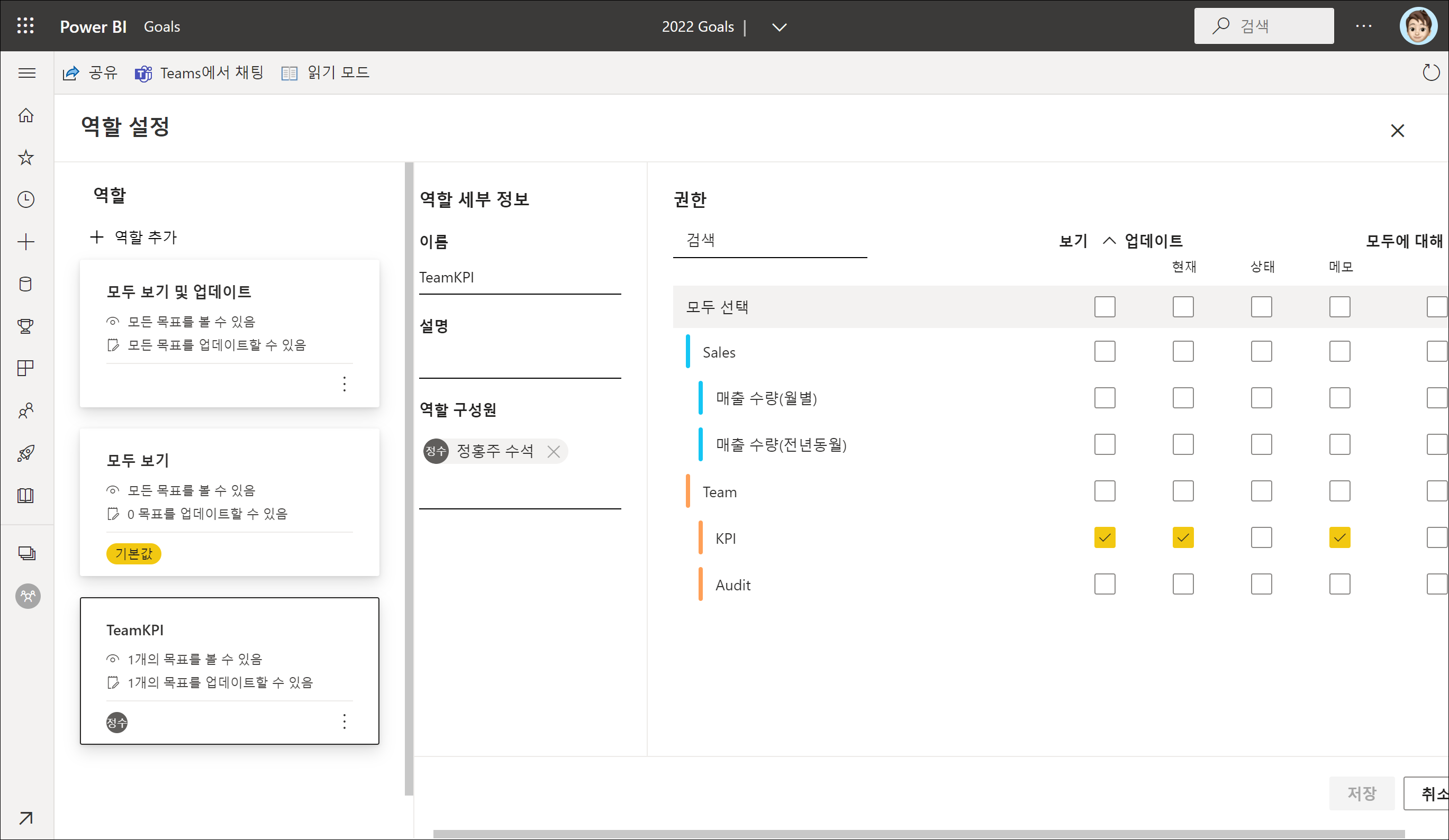 여기서는 역할의 이름을 ‘Team KPI’라고 지정하고 KPI의 현재, 메모 권한을 체크해주겠습니다. 업데이트 권한을 체크하면 자동으로 보기 권한이 지정됩니다. 구성원을 추가하고 [저장]을 클릭합니다.