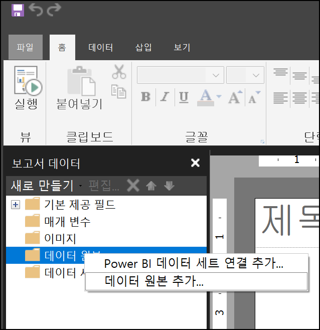 먼저 데이터 원본을 추가해야 합니다. 왼쪽 보고서 데이터 창에서 [데이터 원본]을 오른쪽 클릭하여 [데이터 원본 추가]를 클릭합니다.