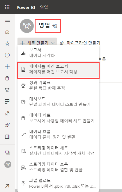 또는 작업 영역으로 이동하여 [새로 만들기]를 클릭하여 [페이지를 매긴 보고서]를 클릭하여 보고서 작성기를 다운로드 할 수 있습니다.